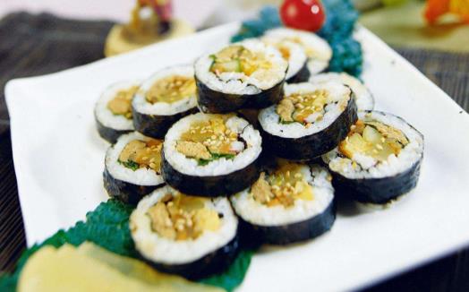 顾名思义,即是用紫菜包卷米饭。方法是:在饭里先加上香油、盐、芝麻等后搅拌,再把切成条状的鸡蛋饼、菠菜、甜萝卜、火腿等放在紫菜里,一起卷。帐篷摊子里卖的紫菜包饭一般比餐厅里卖的要小很多,因此又有迷你紫菜包饭之称。