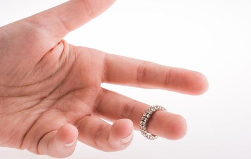 戴戒指是有讲究的。在同一只手上戴两枚戒指时,色泽要一致,而且一枚戒指复杂时,另一枚一定要简单。此外,最好选择相邻的两只手指,如中指和食指、中指和无名指或无名指和小指,千万不要中间隔着一座“山”。